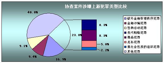从协查涉嫌洗钱案件涉及的上游犯罪类型进行分析,涉及破坏金融管理秩序犯罪的案件最多,占总数的16.9%;其次是涉及金融诈骗犯罪和恐怖活动犯罪的案件,占总数的9.4%和9.1%;涉及非《刑法》191条规定上游犯罪的案件占40.8%(见下图)。
