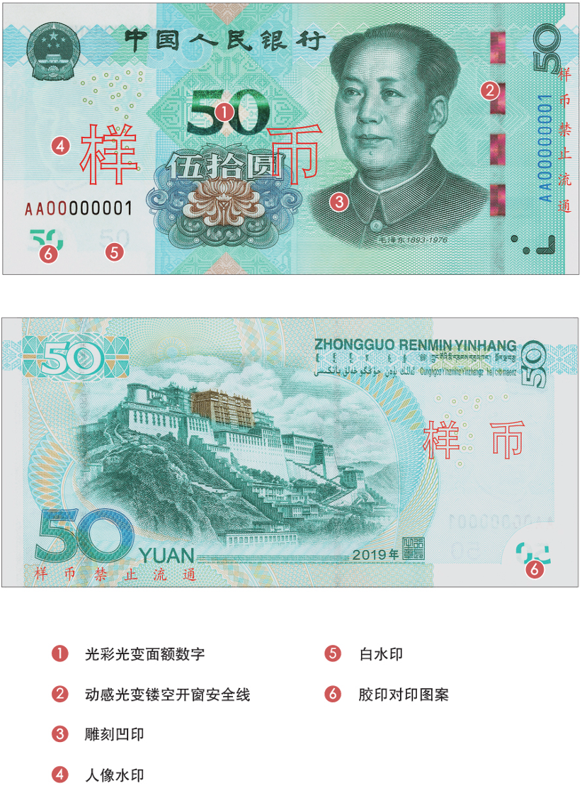 2019年版第五套人民币50元纸币规格、主图案、主色调、“中国人民银行”行名、国徽、盲文面额标记、汉语拼音行名、民族文字等要素,雕刻凹印、白水印等防伪特征,均与2005年版第五套人民币50元纸币相同。