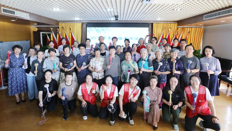 经过一番精心制作,一个个饱满、精致的艾草养生锤诞生了。老同志们手持作品,脸上洋溢着自豪,共同拍照留念。制作结束后,大家还伴随着音乐节奏,用自制的养生锤练习拍打操。