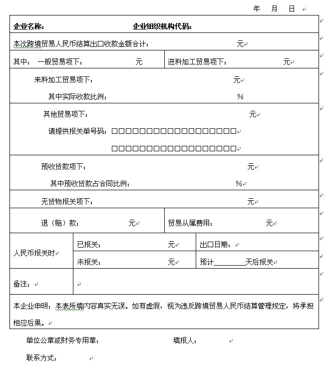 第二十一条 对于跨境贸易人民币结算项下涉及的国际收支交易,试点企业和境内结算银行应当按照《通过金融机构进行国际收支统计申报业务操作规程(试行)》及有关规定办理国际收支统计间接申报。境内企业收到跨境人民币款项时,应填写《涉外收入申报单》并于5个工作日内办理申报;试点企业对外支付人民币款项时,应在提交《境外汇款申请书》或《对外付款/承兑通知书》的同时办理申报。境内结算银行应按照国家外汇管理局关于银行业务系统数据接口规范的规定完善其接口程序。