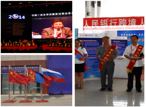 2014中国二连浩特中蒙俄经贸合作洽谈会(简称“二洽会”)是由内蒙古自治区人民政府,蒙古国乌兰巴托市政府、东戈壁省政府,俄罗斯布里亚特共和国政府、伊尔库茨克州政府主办的,旨在密切中蒙俄毗邻地区经贸合作关系的平台。本届“二洽会”主要包括商品展洽、经贸合作论坛、中国边境口岸城市市长论坛和项目推介等活动,共吸引了来自中、蒙、俄等国的458家企业和国内外客商近3万人次参加。人行呼和浩特中支充分借助“二洽会”的有利契机,在全区范围内开展了一系列跨境人民币政策业务宣传活动。