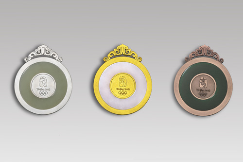 北京奥运会奖牌设计方案为取意金玉良缘的“金镶玉”,由中央美术学院设计,北京奥组委在2007年3月27日公布。“金镶玉”的独特设计成为北京奥运会的一大亮点,同时也是第一次在奥运会奖牌上使用两种不同的材质。