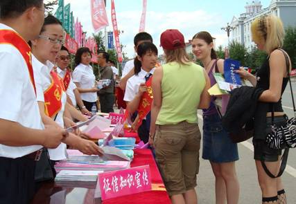 黑龙江漠河北极光节上向外国游客进行征信知识宣传