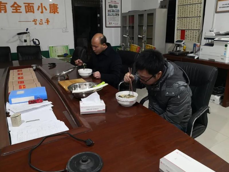在全力推进扶贫产业投产的同时,“三兄弟”还通过电话、网络等渠道积极宣传扶贫政策,了解贫困群众关切,逐户摸排各家情况,提升帮扶精准度,分类分批解决群众春耕生产和日常生活中的困难和问题,全力以赴推进脱贫攻坚。吃住在村部、24小时待命已成为“三兄弟”的日常。他们将村委会变成村疫情防控和脱贫攻坚的指挥部、住宿点和食堂,忙碌得忘记做饭,就用方便面、饼干顶上,平日里一顿西红柿鸡蛋面就是大餐。面对困难时,他们会开玩笑式地相互鼓励:“没有什么困难是一顿西红柿鸡蛋面解决不了的!”看到全体村民身体安康,看到扶贫产业开动,看到大家满意的笑脸,驻村“三兄弟”觉得所有的付出都是值得的。